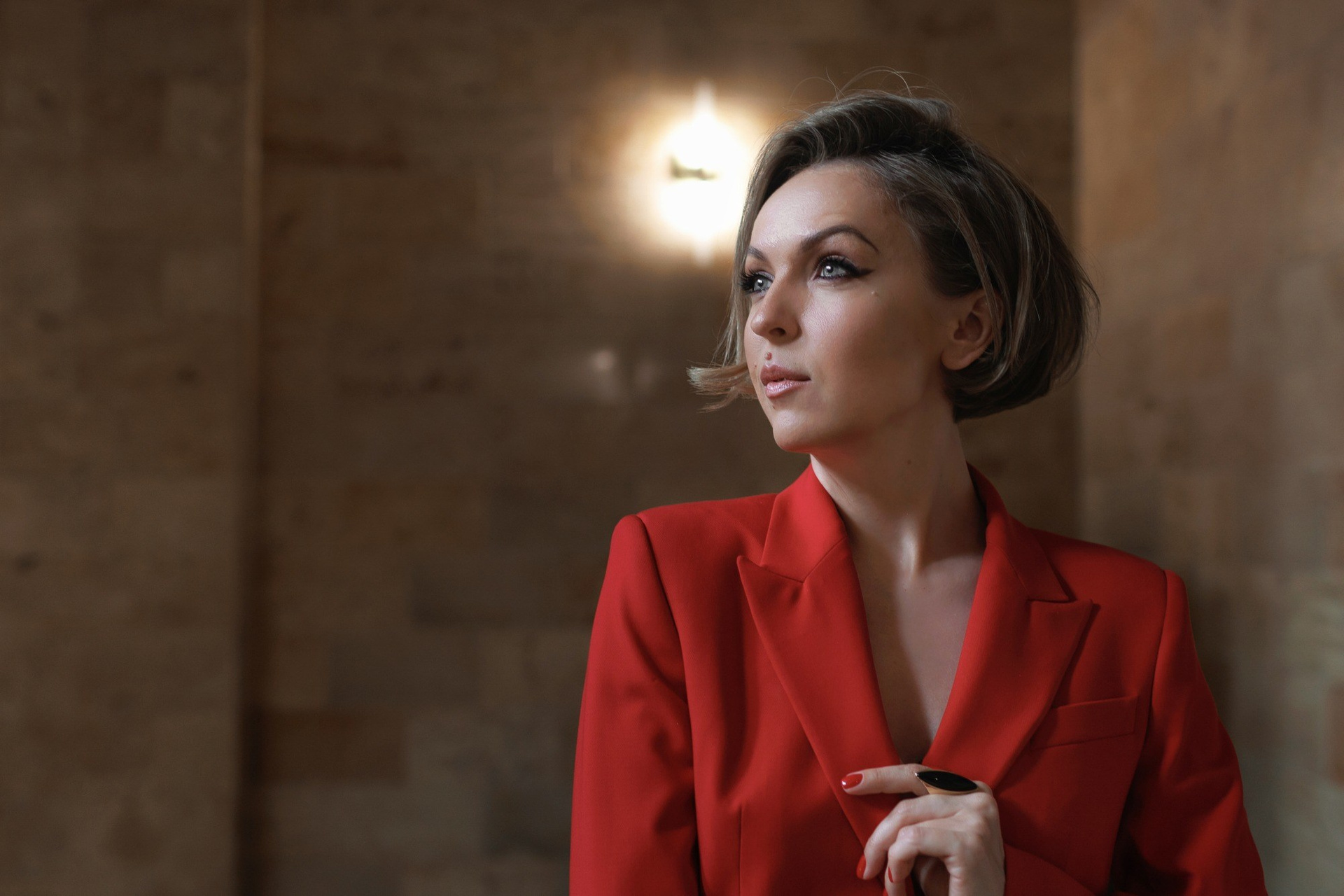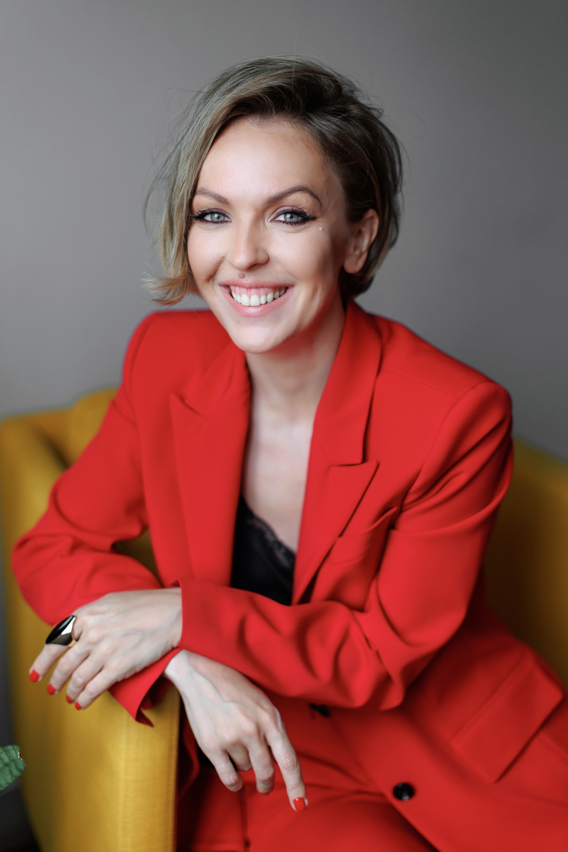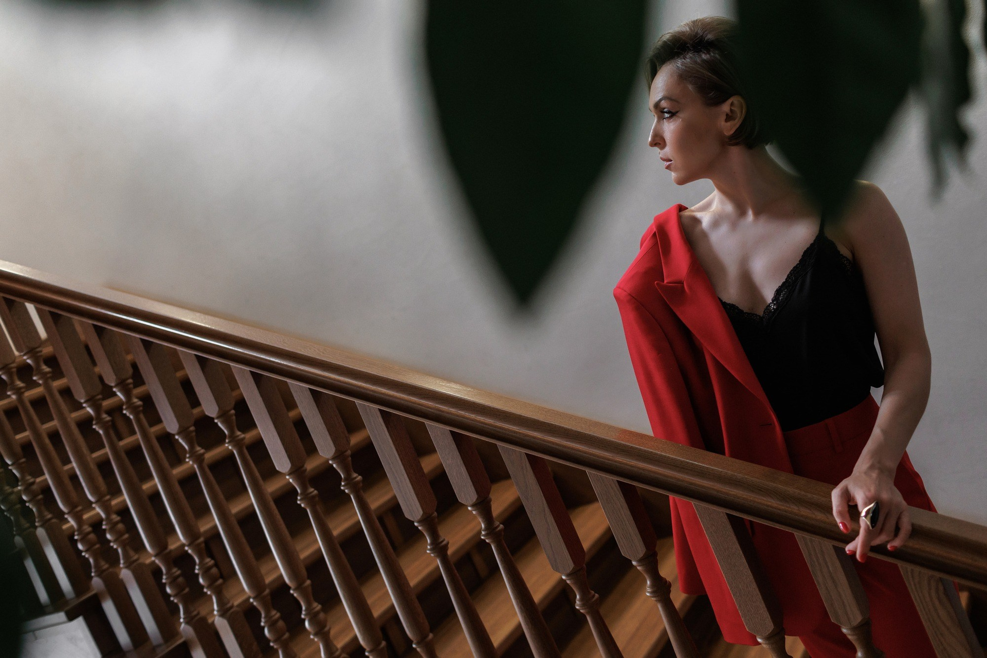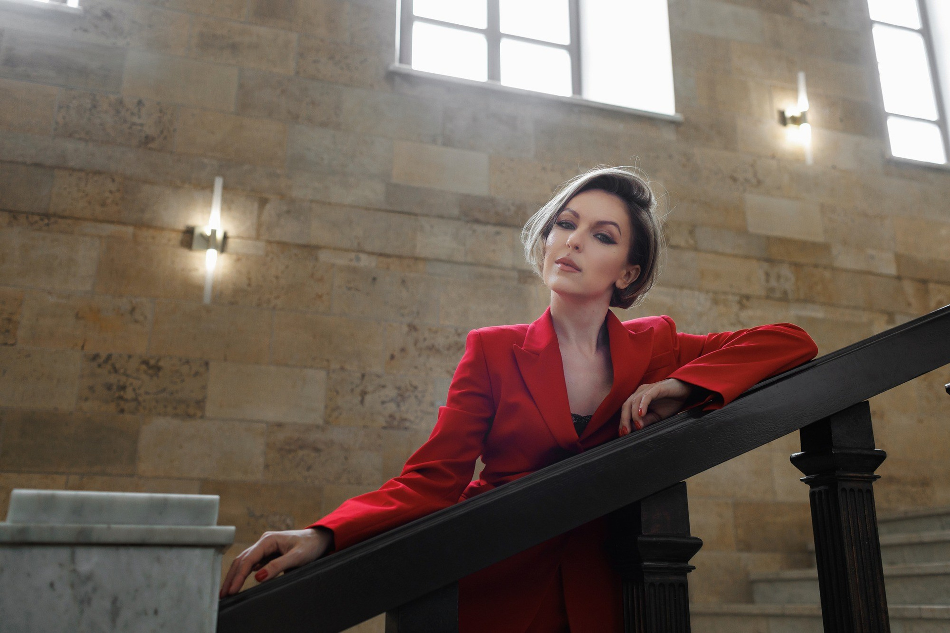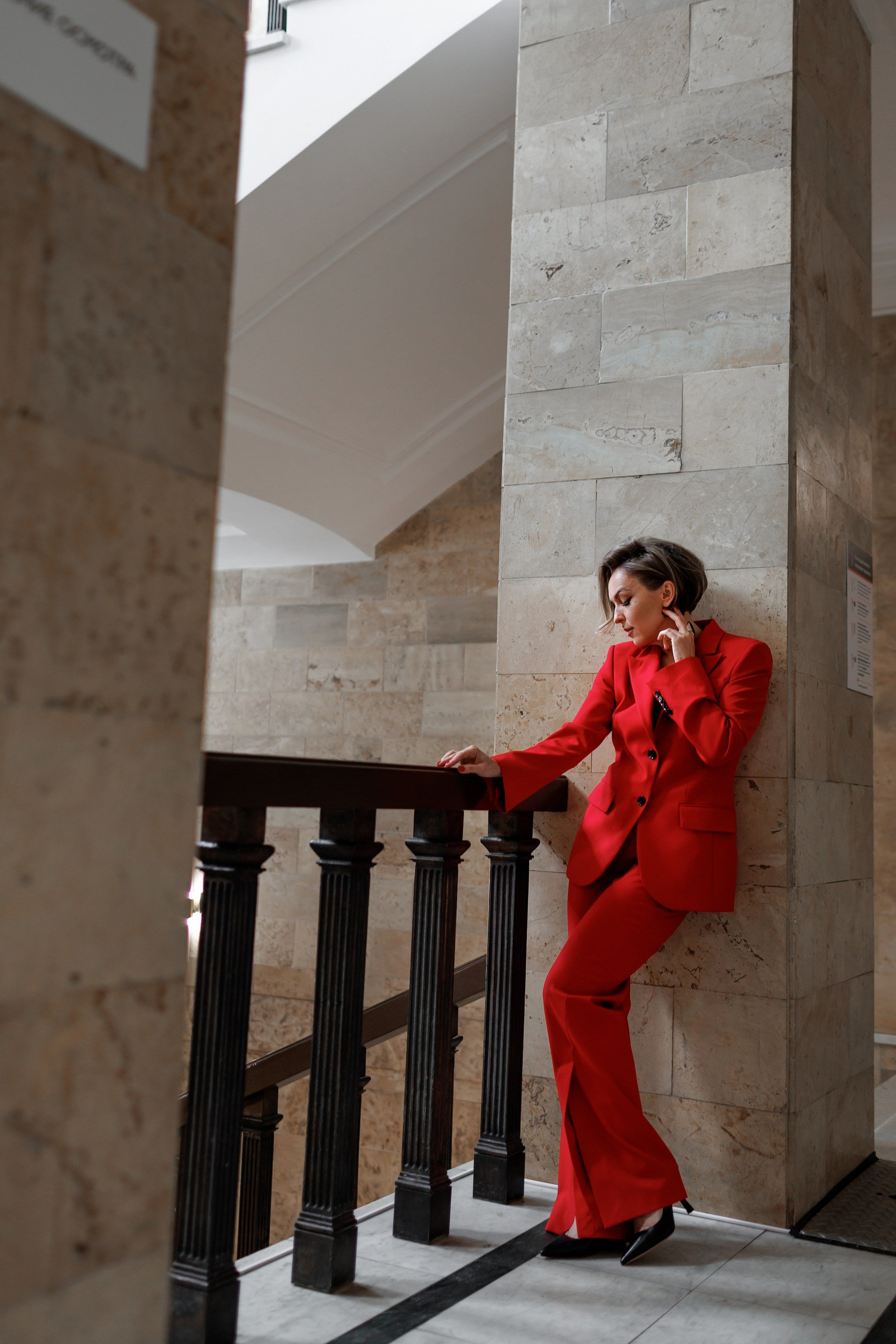 Линии, красный цвет, смаз, контрасты, мы специально пользовались разными фотографическими приемами, что бы даже в одном образе получить разные по настроению и типажу кадры. Оля открытый и искренний человек, поэтому много портретов со взглядом в кадр, серьезных и с улыбкой! Ну, а красный костюм и красный зал стали изюминкой всей съемки!