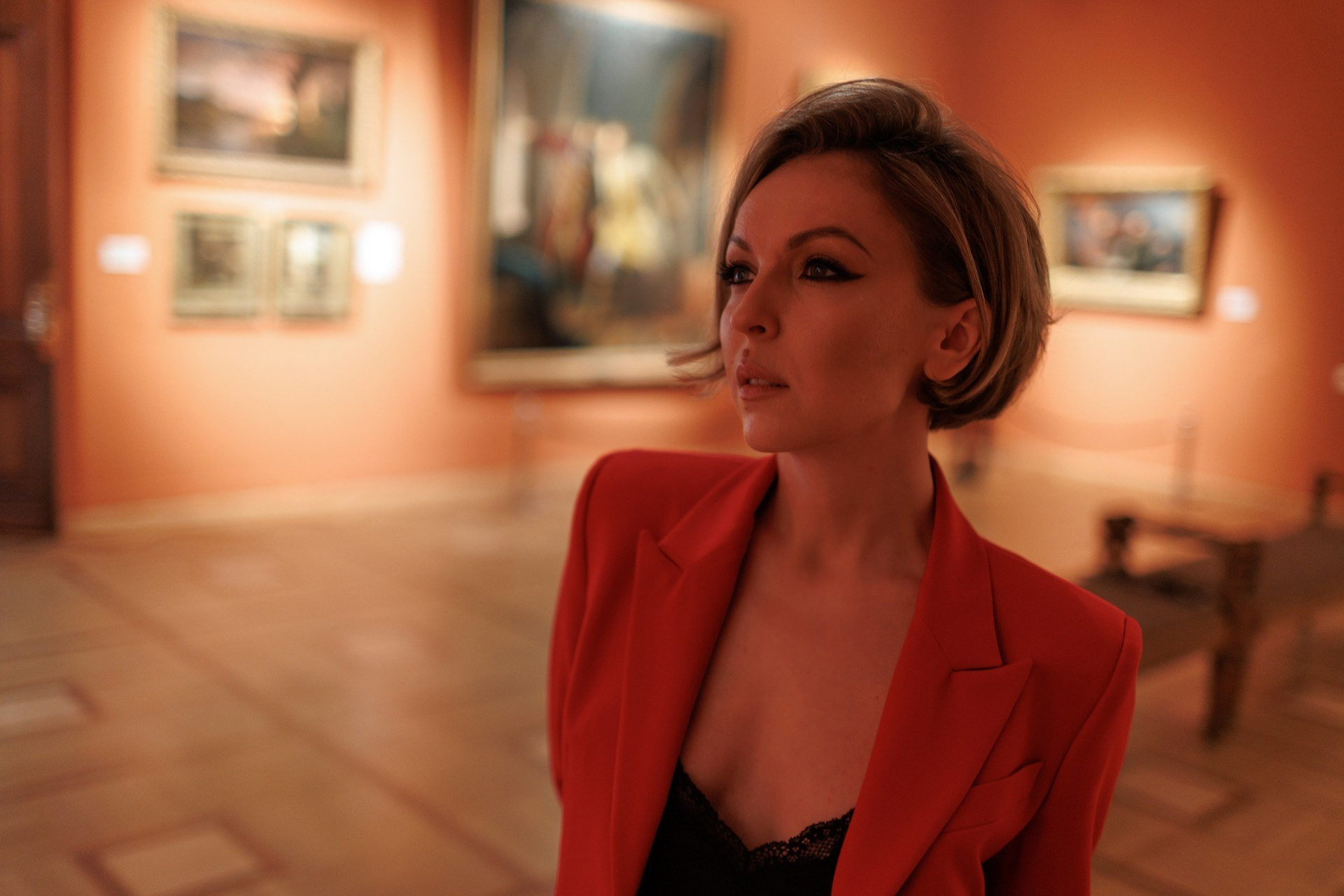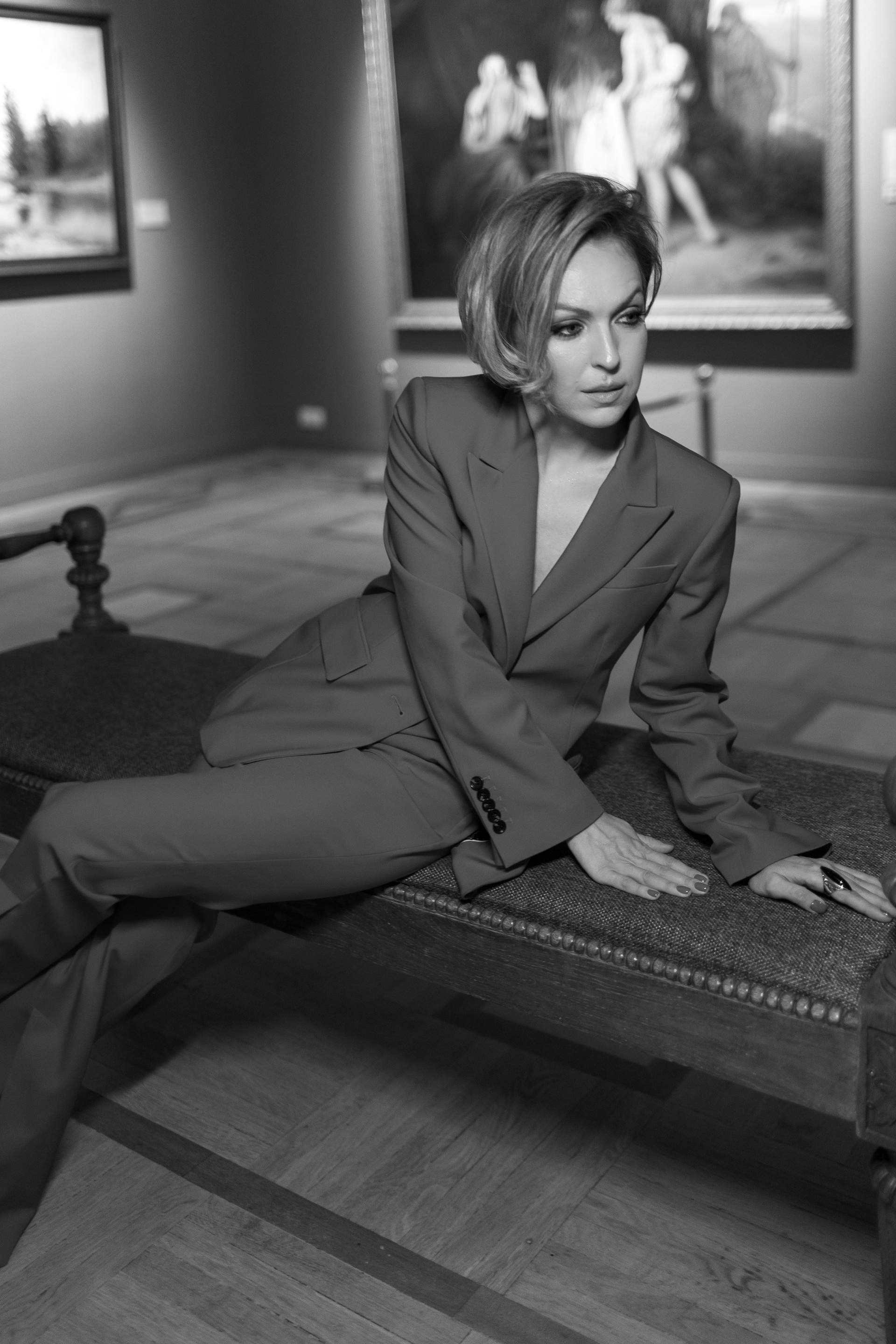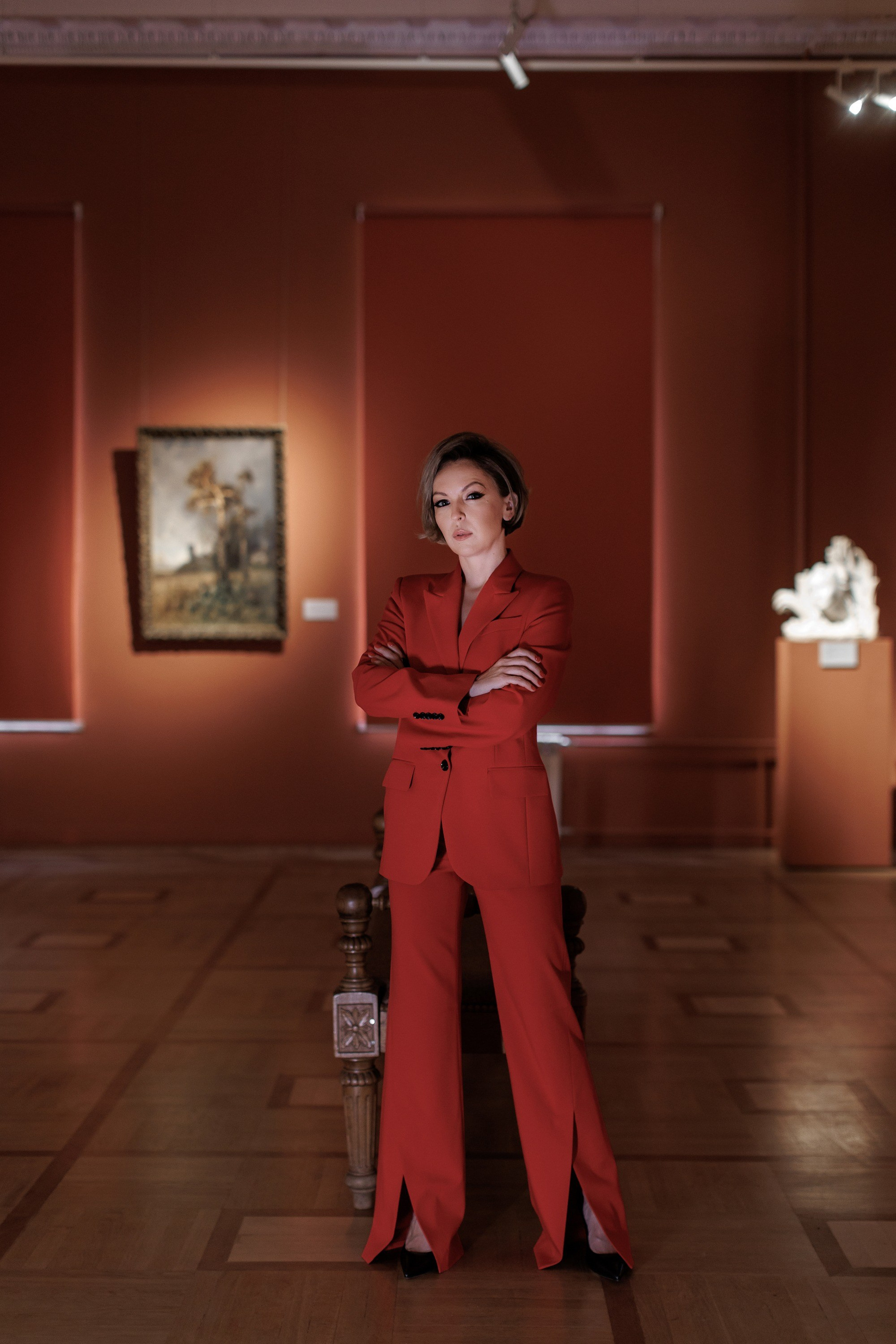 Задача перед съемкой стояла показать изящество, женственность, стиль и в тоже время творческую составляющую руководителя. Поэтому локацией для съемки был специально выбран художественный музей, со своей глубокой историей и особенной архитектурой. Мне хотелось органично вписать Олю в интерьер музея, показать ее взаимосвязь с чуткостью и искусством. На части кадров подчеркнуть внутреннюю силу, а на части женственность девушки даже в деловом костюме.