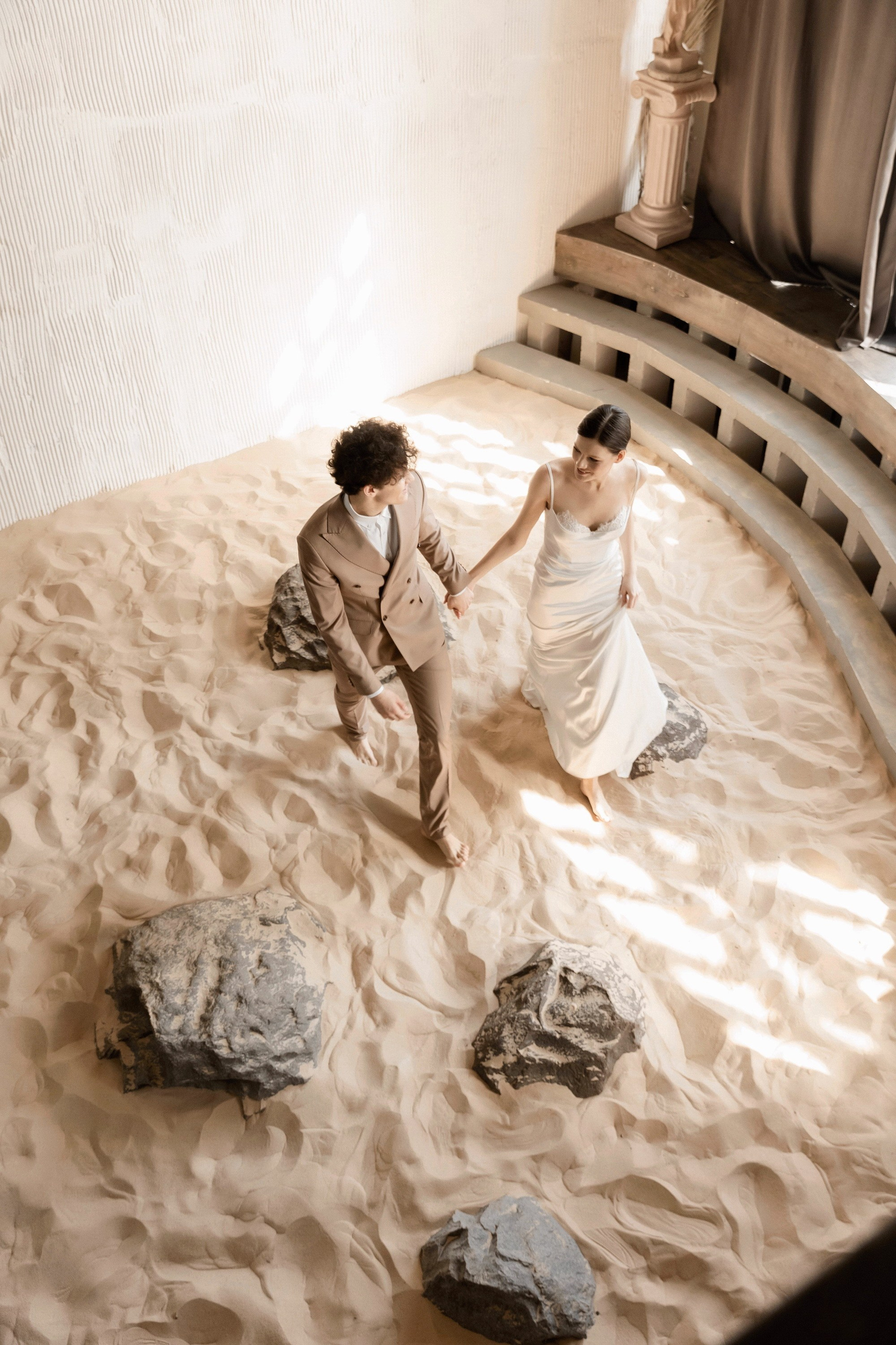 И вдруг, мы видим, что у нас в городе открывается новая студия с греческими акцентами и морским песком. Мы с свадебным салоном Love and lace просто влюбились в эту локацию, и мы решаем съемке быть тут в светлых пастельных тонах. Вместе со стилистами согласовываем образы и приступаем.